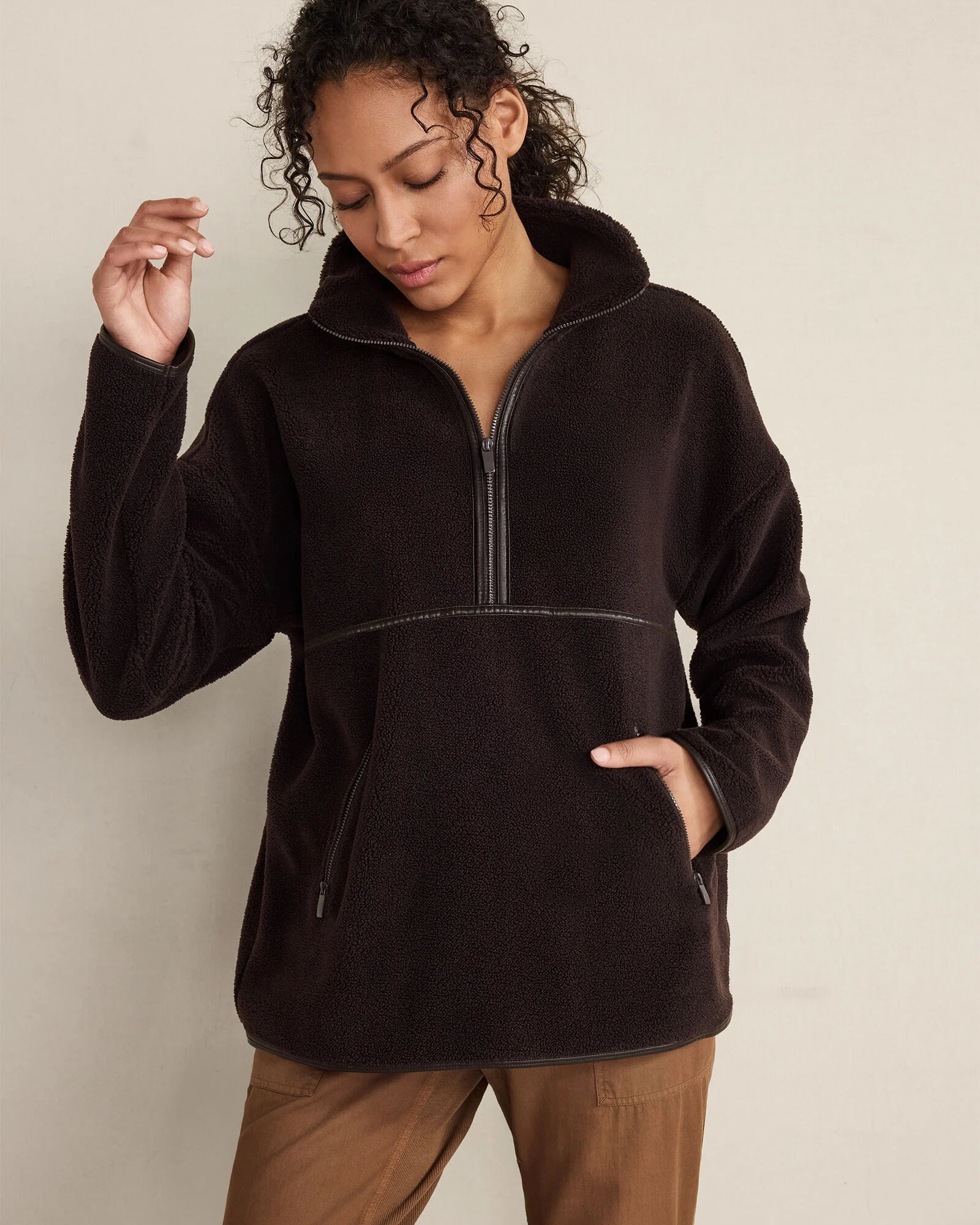 The weightless warmth of faux sherpa meets the ease of your favorite pullover. Designed with a half-zip closure and zippered side pockets for all-day comfort and wearability.